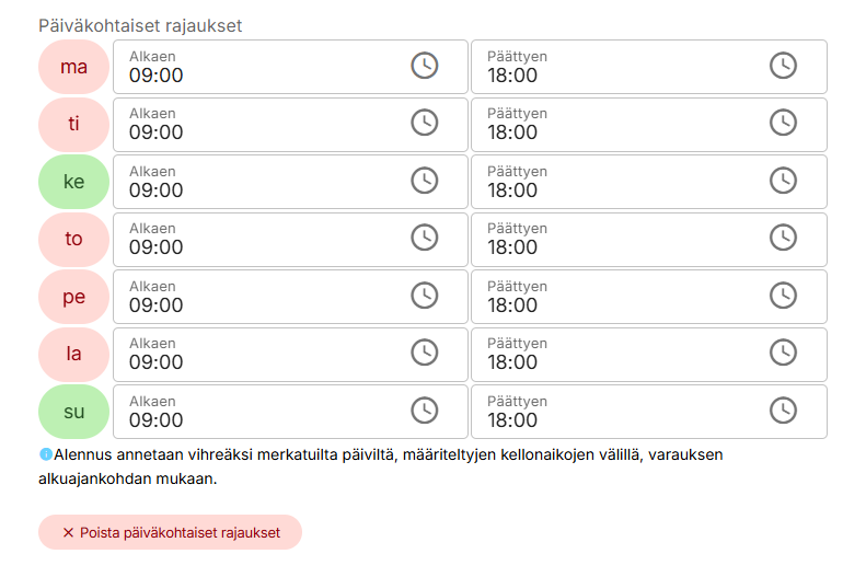 Alennuskampanjan voi myös rajata viikonpäivän, tai kellonajan mukaan klikkaamalla vihreää Lisää päiväkohtaisia rajoituksia -laatikkoa.
