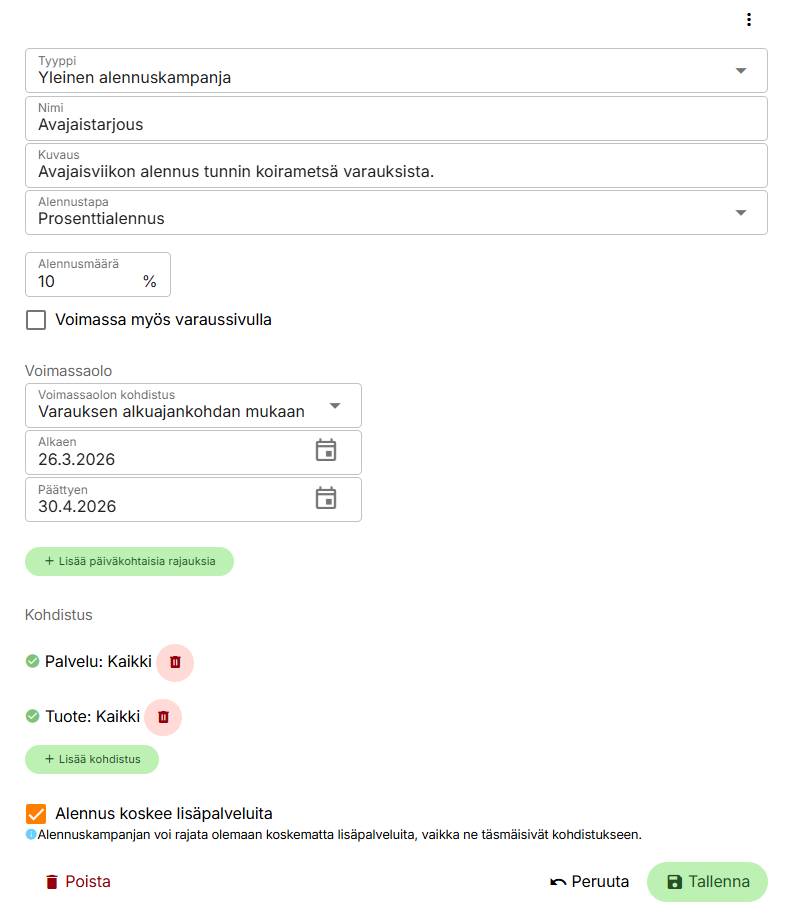 Oletuksena alennus annetaan kaikista palveluista, lisäpalveluista ja tuotteista, jos kohdistusta ei ole erikseen lisätty. Alennuksen voi halutessa kohdistaa tiettyyn palveluryhmään, palveluun, tuoteryhmään tai tuotteeseen sekä rajata sen olemaan koskematta lisäpalveluita.