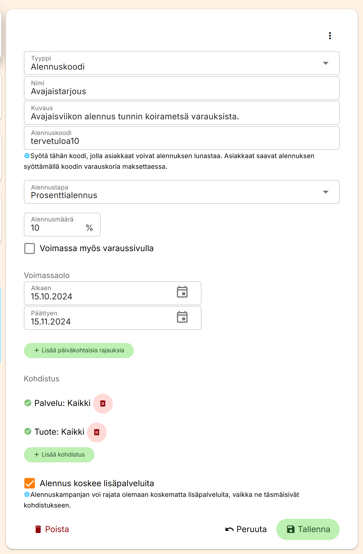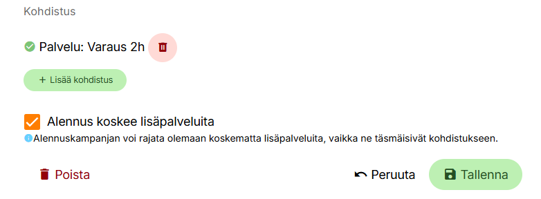 Oletuksena alennus annetaan kaikista palveluista ja lisäpalveluista, jos kohdistusta ei ole erikseen lisätty. Alennuksen voi halutessa kohdistaa tiettyyn palveluryhmään tai palveluun sekä rajata sen olemaan koskematta lisäpalveluita.