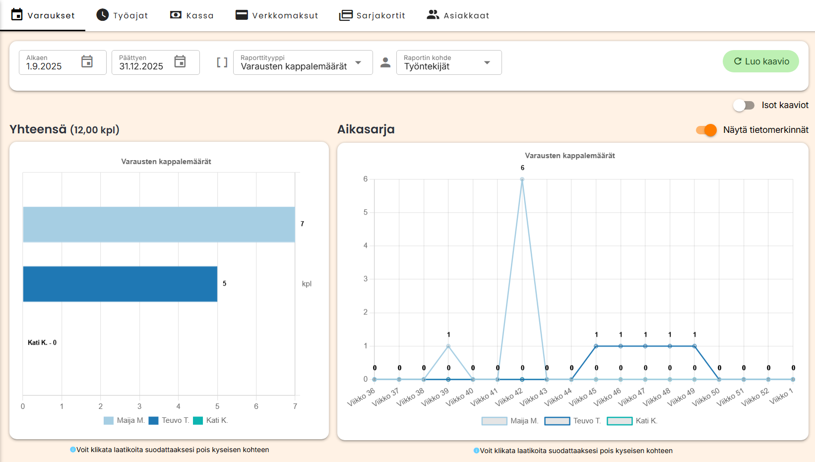 Käyntikerrat saat näkyville Raportit → Varaukset -näkymästä sivun yläosassa olevasta graafisesta raportista, kun valitset Raporttityyppi: Varausten kappalemäärä ja painat luo kaavio. Käyntikerrat näet laittamalla hiiren Yhteensä-pylväsdiagrammien päälle.