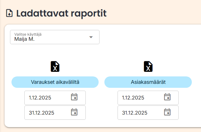 Ladattavan asiakasmääräraportin löydät Raportit → Varaukset -näkymästä rullaamalla sivua alaspäin ja valitsemalla Ladattavat raportit -kohdan alta Asiakasmäärät. Tällä raportilla saat työntekijöittäin eriteltyä, montako eri asiakasta hänellä on käynyt tietyllä aikavälillä.