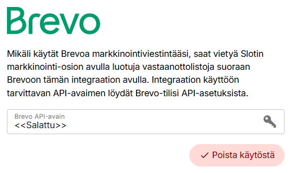 Slotin integraatiolla Brevon kanssa mahdollistat uutiskirjeen lähetyksen asiakkaille helposti. Slotti valitsee asiakasrekisteristä markkinointiluvan antaneet asiakkaat, ja vie heidän yhteystiedot Brevoon, jolloin saat helposti vastaanottajalistan uutiskirjeellesi.