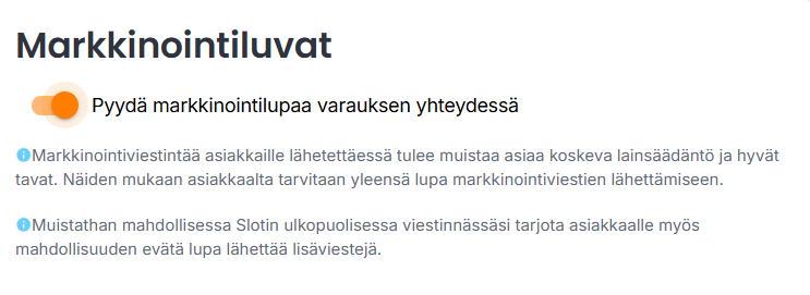 Nyt voit ladata listauksen asiakkaista, jotka ovat antaneet varauksensa yhteydessä markkinointiluvan ja sähköpostiosoitteensa. Kun menet Slotissa Markkinointi → suoramarkkinointi, voit lisätä asiakaslistaukseen tarkempia hakukriteereitä.