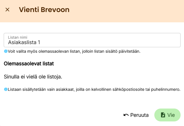 Kun kriteerit on määritelty, klikkaa ensin Hae asiakkaat ja sen jälkeen Vie Brevoon. Tämän jälkeen voit luoda Brevossa uutiskirjeen, ja sen luomisen jälkeen lataamasi listaus löytyy Brevosta.