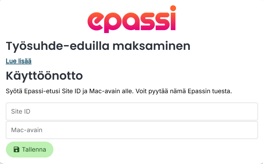 - Site ID on Epassi käyttäjätunnuksesi (numerosarja) ja Mac-avaimen voit pyytää Epassin tuesta.