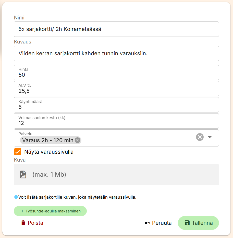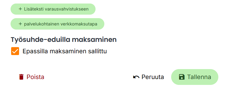Varaussivulle on lisätty mahdollisuus maksaa Epassilla. Ominaisuuden avulla asiakkaat voivat maksaa varauksensa tai sarjakortin suoraan Epassi-saldolla muiden maksutapojen ohella. Lisäksi voit määrittää, mihin palveluihin Epassi-maksu on sallittu.
