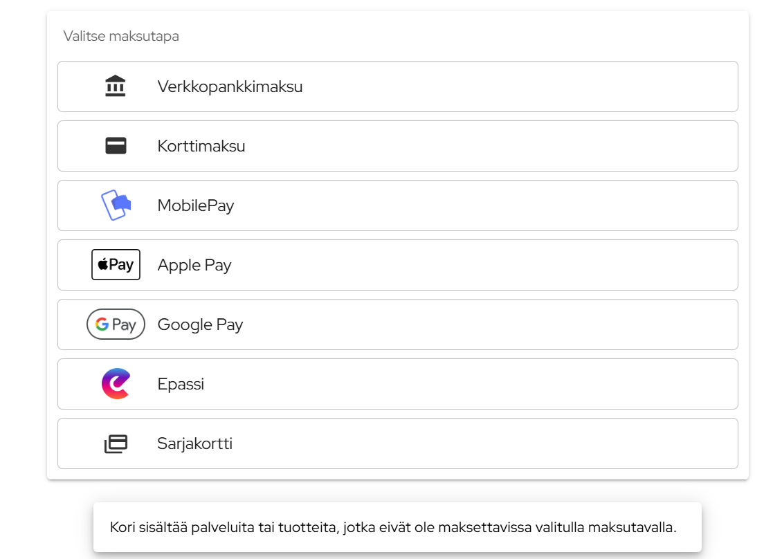 Mikäli ostoskorissa on palveluita, joita ei voi maksaa Epassilla, Slotti ilmoittaa siitä asiakkaalle maksusivulla.