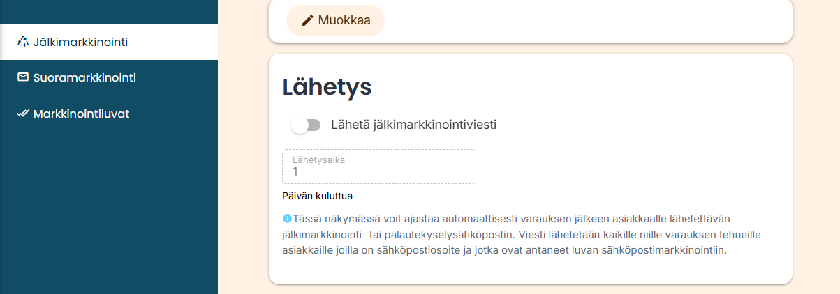 Markkinointi → Jälkimarkkinointi -näkymässä, kun toiminto on kytketty päälle.