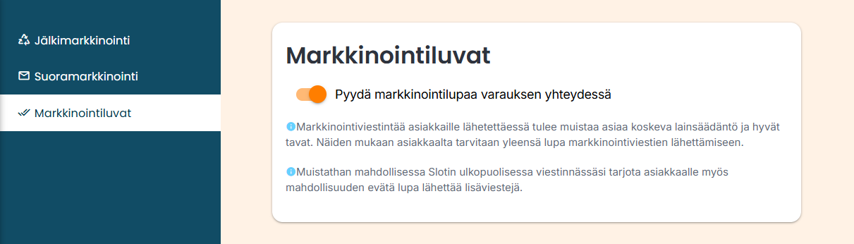 - Kytke markkinointiluvat päälle Markkinointi → Markkinointiluvat -näkymästä, jolloin asiakkaalta pyydetään lupa markkinointiin varaussivulla varauksen yhteydessä.