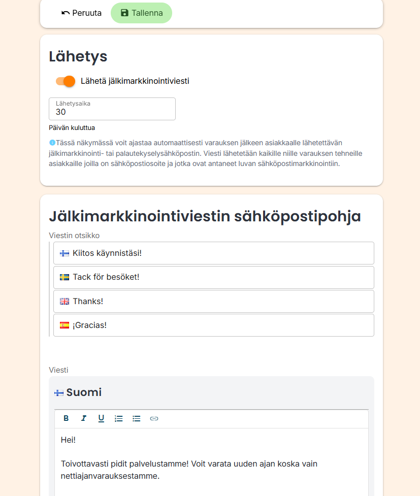 Voit muokata lähetettävän jälkimarkkinointiviestin sisältöä itselle sopivaksi