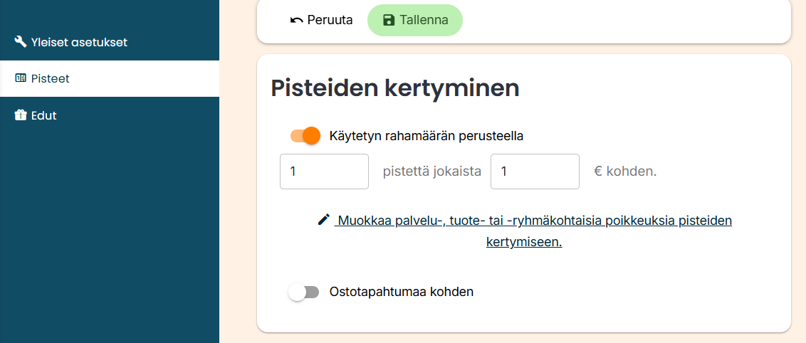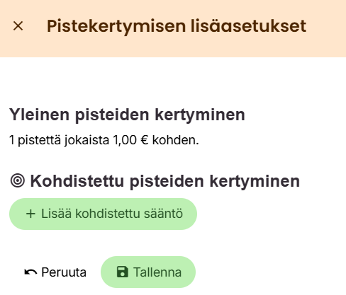 Voit määrittää kertyykö pisteitä käytetyn rahamäärän perusteella vai tehtyä ostotapahtumaa kohden.