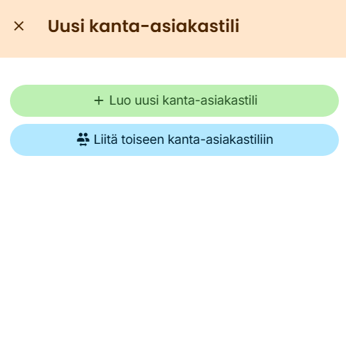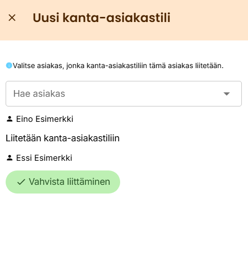 Seuraavan ohjeen avulla voit liittää asiakkaan jo olemassa olevaan kanta-asiakastiliin. Jos liitettävällä asiakkaalla ei vielä ole kanta-asiakastiliä, voit siirtyä suoraan 4. kohtaan.
