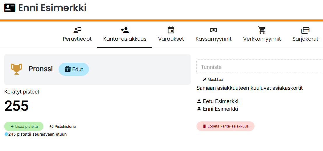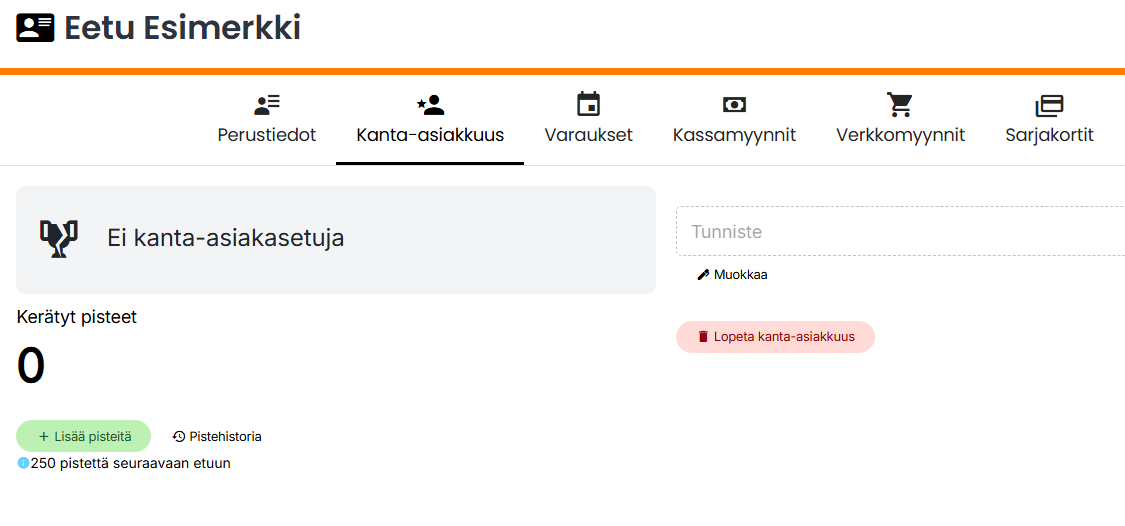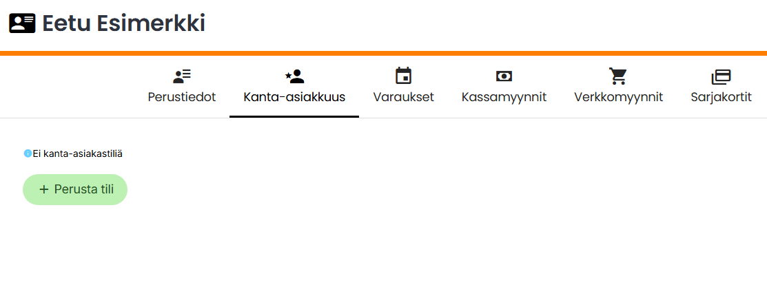 Jos asiakkaalla ei vielä ole kanta-asiakastiliä, voit perustaa sellaisen asiakaskortilla Asiakkaat -välilehdellä.