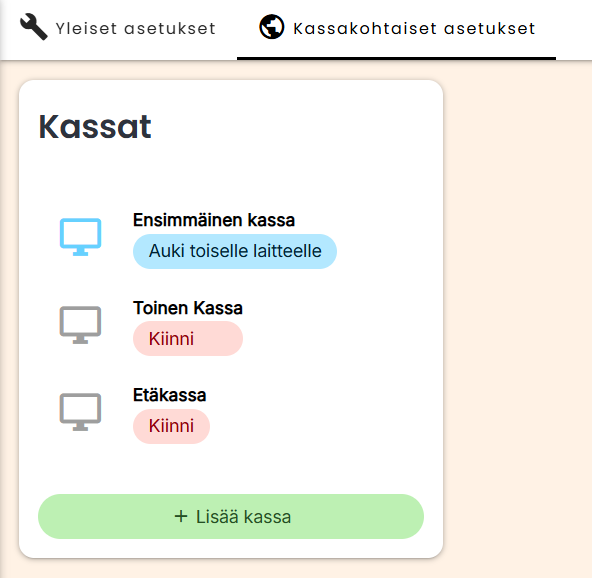 Virtuaalikassoja voi lisätä ja niiden asetuksia muokata Asetukset -> Kassa -> Kassakohtaiset asetukset -näkymässä. Kassapisteet kannatta nimetä niiden käyttötarkoituksen mukaisesti, esimerkiksi tarkoitetun kiinteän kassapisteen tai käyttötavan mukaan.