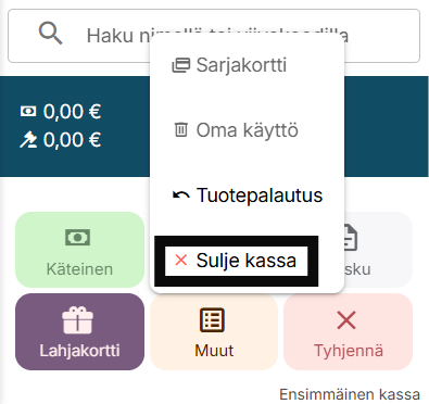 Jos haluat vaihtaa käytössä olevalle laitteelle avattua kassaa, onnistuu se valitsemalla alareunan maksupainikkeiden luota Muut -> Sulje kassa ja sitten valitsemalla haluamasi kassan valikosta. Mikäli kassa on jo auki toisella laittella, pyytää Slotti vahvistamaan kassan avaamisen myyntiä varten.