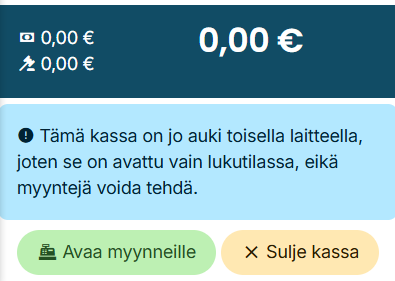 Mikäli kassa on aiemmin avattu käyttöön toisella laitteella, kassaa avattaessa aukeaa se ensin "Vain luku" -tilaan, missä uusia myyntejä ei voi tehdä. "Vain luku" -tilassa voi kuitenkin tarkastella kassatapahtumia ja raportteja.