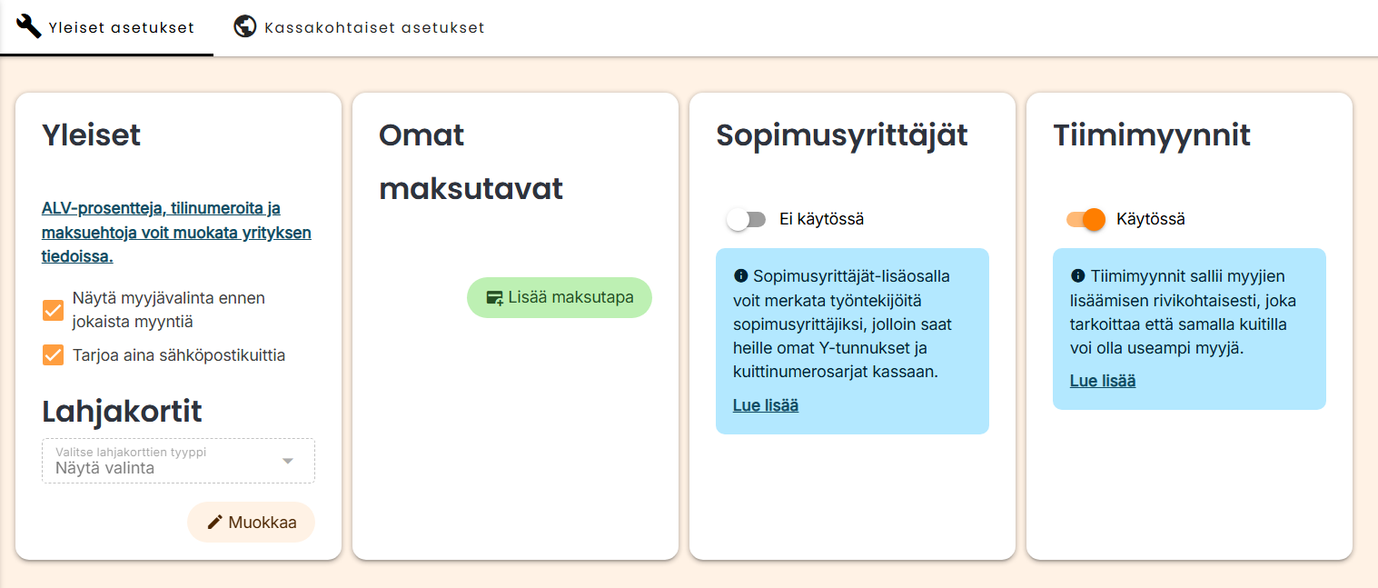 Tiimimyynnit-lisäosa sallii useamman myyjän lisäämisen samalle kuitille, jolloin voit määrittää myyjät rivikohtaisesti. Tiimimyynnit on saatavilla Kassan pro-paketissa.