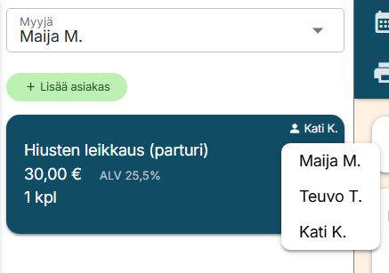 Kun tiimimyynnit on käytössä, voit siirtyä normaalisti kassaan tekemään uutta myyntiä. Kun lisäät palveluita tai tuotteita myyntiin, voit vaihtaa myyjää rivikohtaisesti klikkaamalla laatikon oikeassa yläkulmassa olevaa valkoista nuolta.