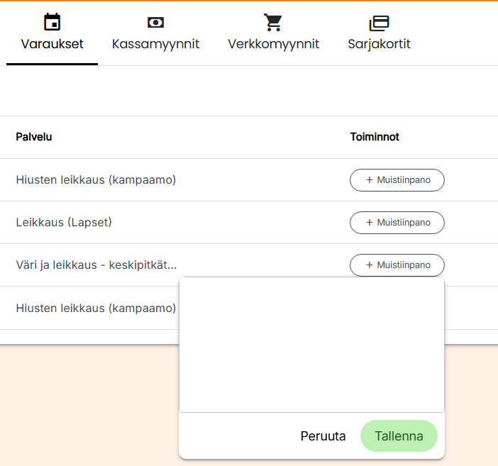 Kun varaukselle / käynnille on tallennettu muistiinpanoja, näkyy muistiinpanon pari ensimmäistä sanaa kyseisen varauksen rivillä varaushistoriassa. Muistiinpanot tallennetaan salatussa muodossa, joten niiden sisällön perusteella ei valitettavasti voi etsiä asiakkaita asiakasrekisterin hakutoiminnolla.