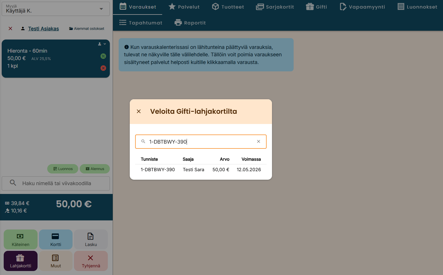 Jos sinulla on Gifti-lahjakortit integroituna kassaan, voit vastaanottaa maksun palvelusta, varauksesta tai tuotteesta lahjakortilla.