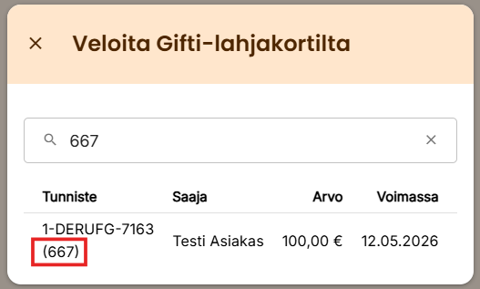 Mikäli käytät lahjakorteissasi omaa tunnistetta, voit hakea sen kassasta normaalisti käyttämällä omaa tunnistetta. Oma tunniste näkyy lahjakorttia veloittaessa suluissa Giftin luoman tunnisteen jälkeen.