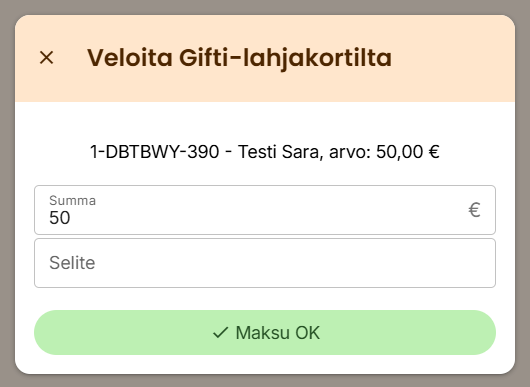 Kun veloitat Gifti-lahjakortilta Slotin kassassa, ohjelma päivittää automaattisesti lahjakortin uuden arvon suoraan Giftiin. Lahjakortin käyttötapa ja ALV haetaan myös automaattisesti Giftin tiedoista.