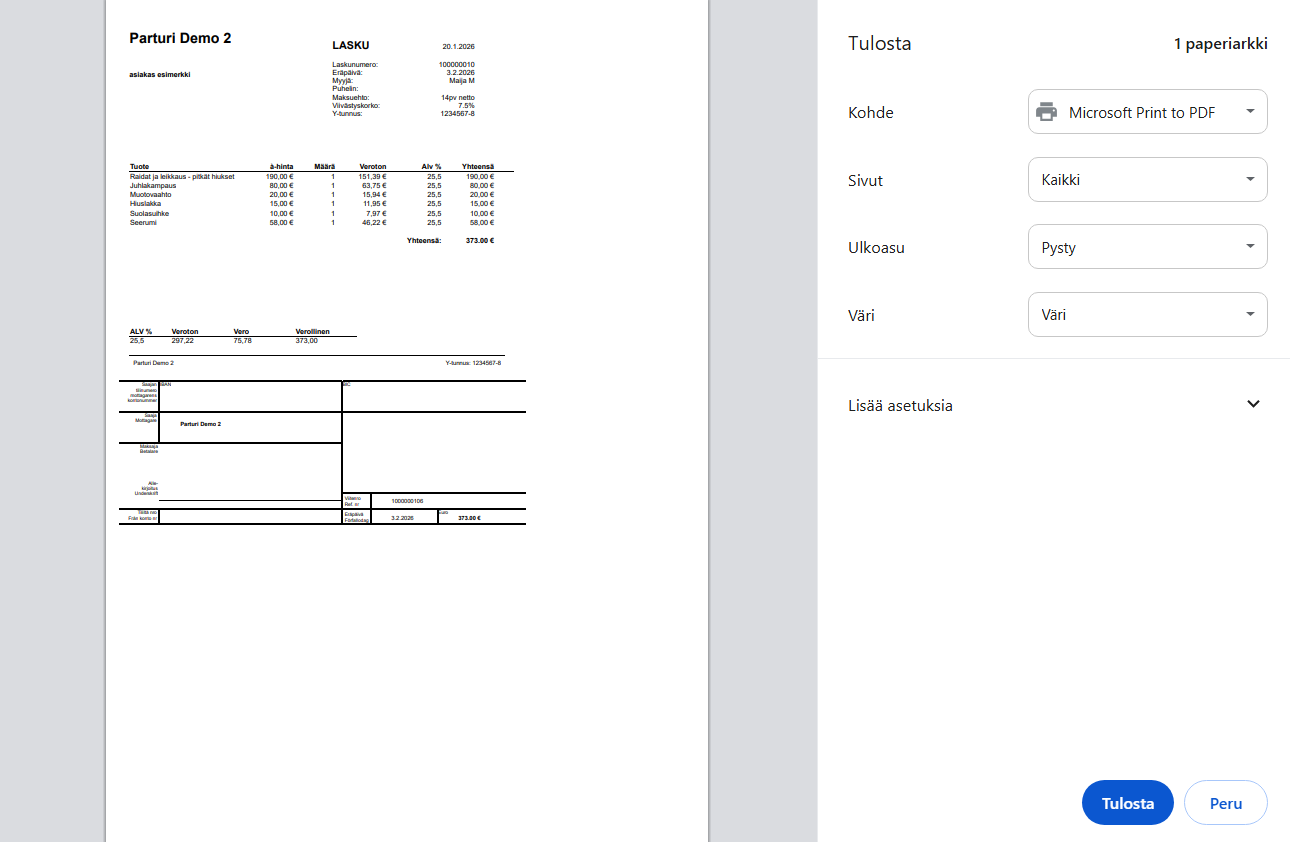 valitsemalla oikea tulostin tai tallenna lasku PDF-tiedostoksi.