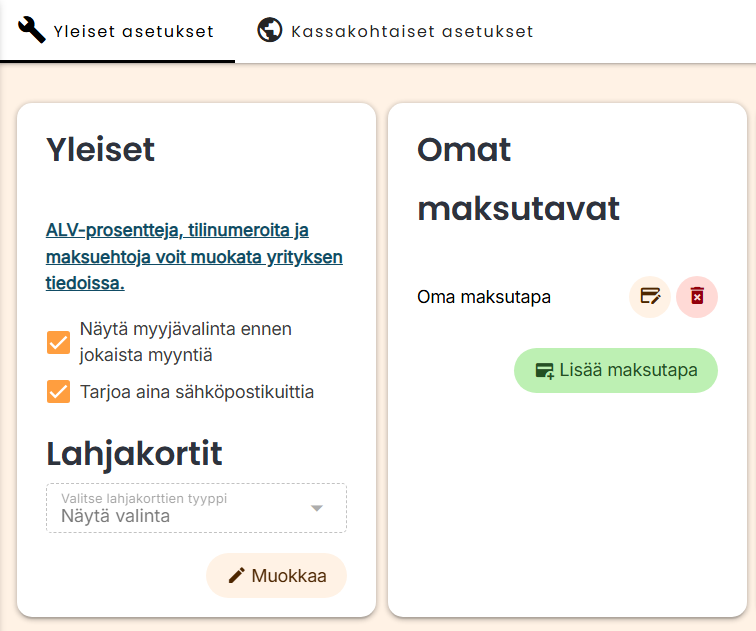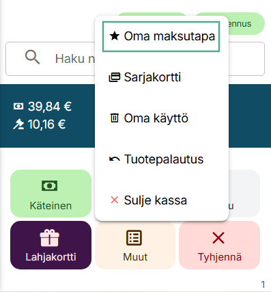 Voit lisätä tai poistaa maksutapoja Asetukset → Kassa -näkymässä. Uudet maksutavat löydät kassan Muut-valinnan alta.