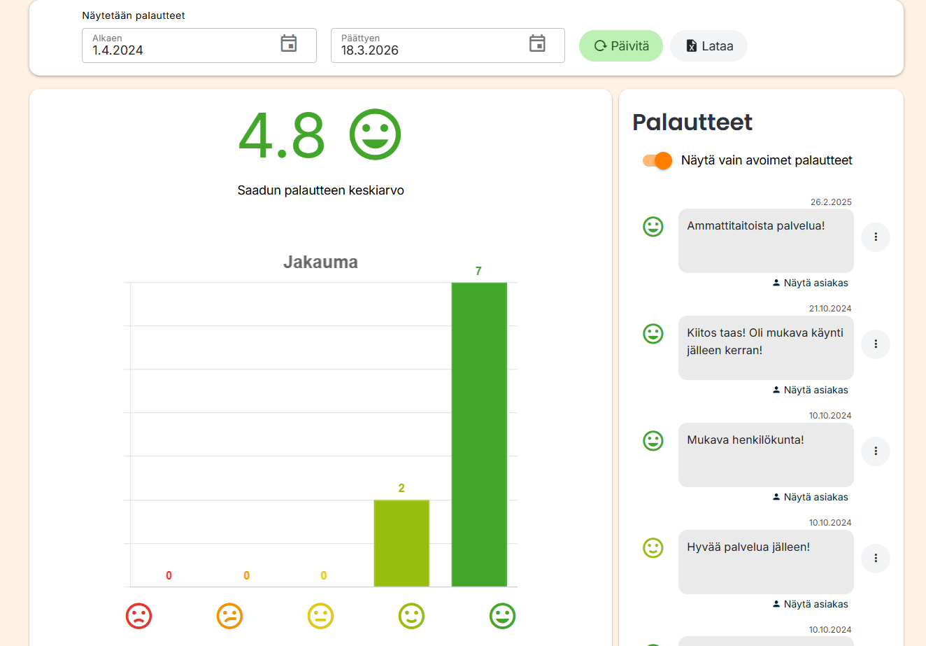 Voit valita näytettävien palautteiden aikavälin sivun yläreunasta. Klikkaamalla Päivitä-painiketta Slotti hakee näkyviin palautteet valitulta aikaväliltä. Näet keskellä saatujen palautteiden keskiarvon ja jakauman sekä oikeassa reunassa avoimet palautteet.