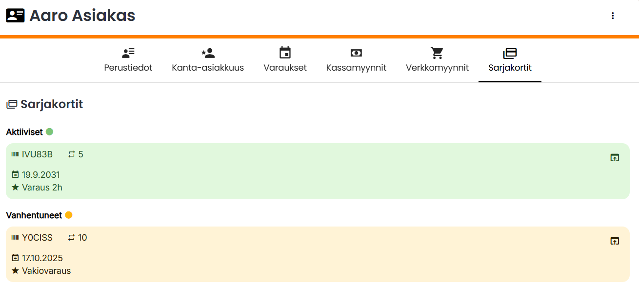 Ostettu sarjakortti liitetään sen ostaneen asiakkaan tietoihin, mutta korttia voi käyttää kuka tahansa, jolla on kortin koodi tiedossa. Asiakaskortilta näet asiakkaan ostamien sarjakorttien tarkemmat tiedot.
