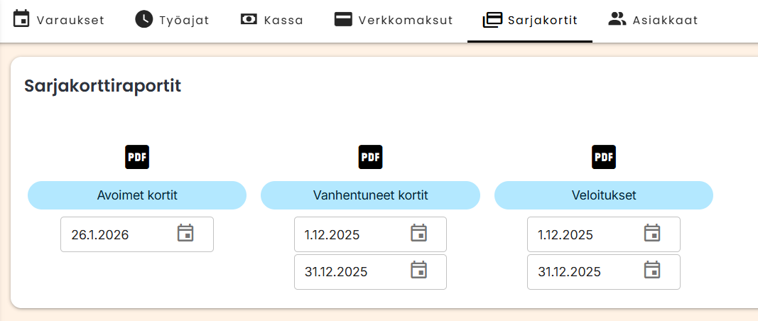 Raportit avoimista ja vanhentuneista korteista sekä sarjakorteilta tehdyistä veloituksista ovat ladattavissa Raportit → Sarjakortit -sivulta.