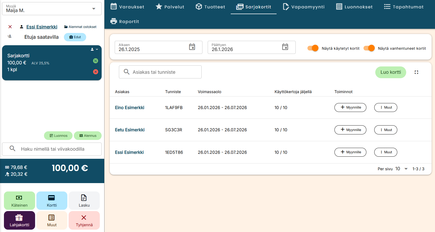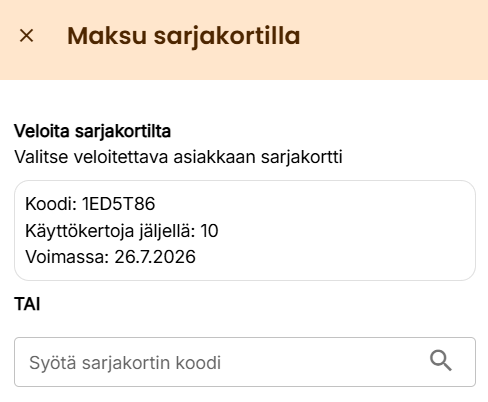 Kassa hyväksyy maksun sarjakortilla vain silloin, kun koodilla löytyy voimassaoleva sarjakorttituote ja käyttökertoja on tarpeeksi jäljellä myynnin maksamiseen. Huomioithan, että myynnissä voi olla ainoastaan sellaisia palveluita, joihin sarjakorttituote on yksilöity.