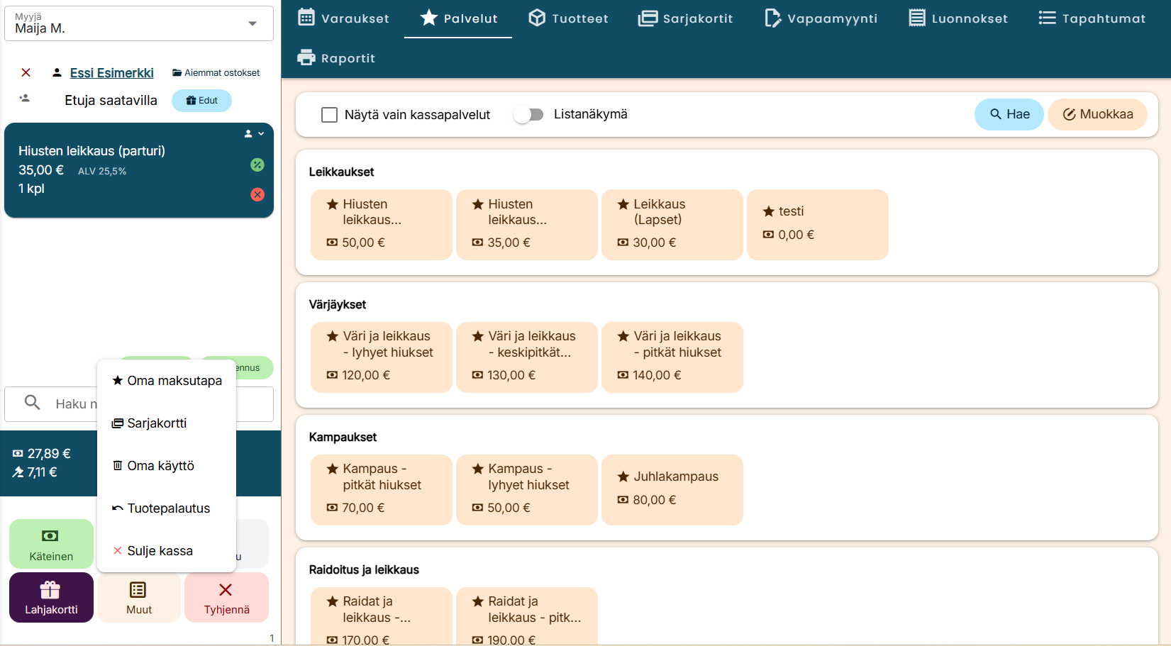 Kun asiakas maksaa palvelun, johon hän on aikaisemmin ostanut sarjakortin, maksu otetaan vastaan kassan Muut-painikkeen alta löytyvällä Sarjakortti-maksutavalla.