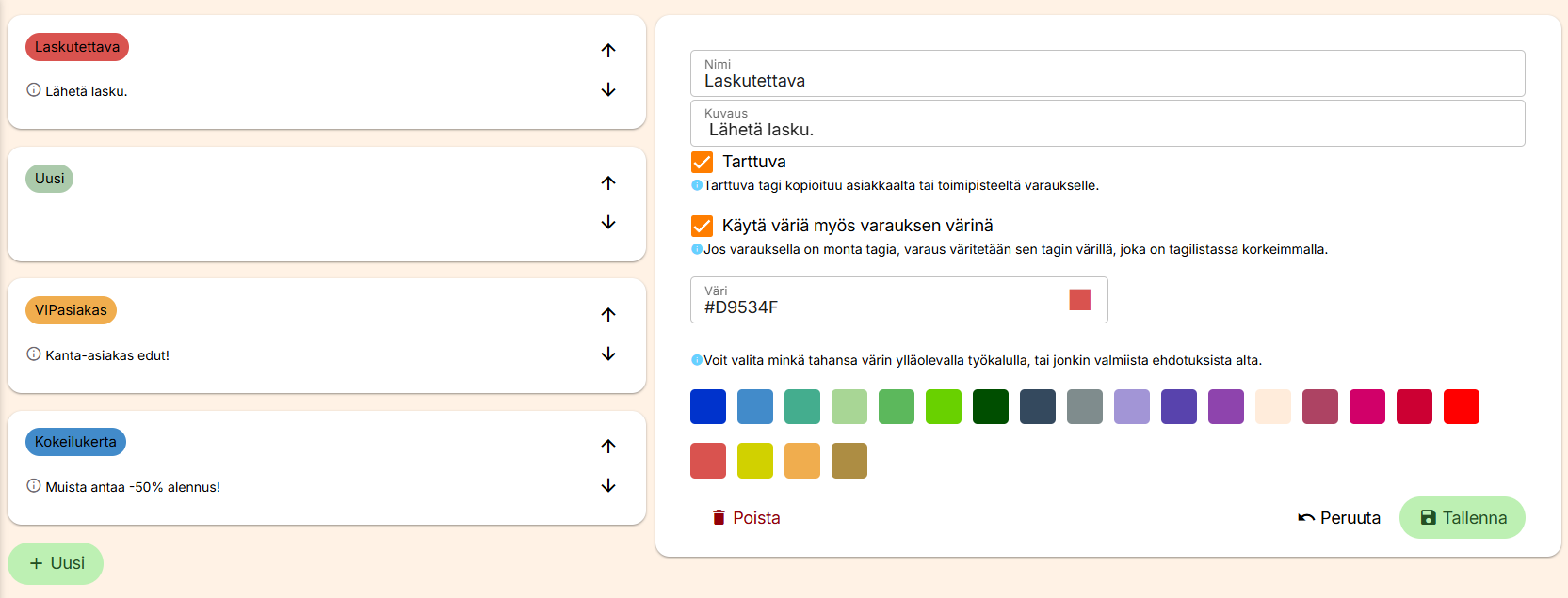 Voit järjestää listassa olevia tageja nuolien avulla. Järjestys vaikuttaa silloin, kun tagin väri on valittu käytettäväksi myös varauksen värinä. Tällöin varauksen väri valikoituu sen mukaan, mikä tageista on listassa korkeimmalla.
