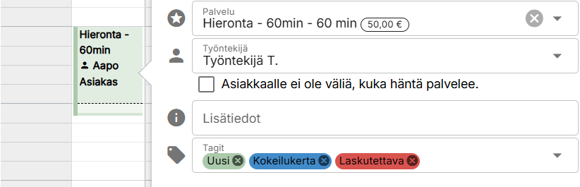 Slotissa on mahdollista lisätä tageja palvelulle, varaukselle, asiakkaalle ja toimipisteelle, mikä helpottaa hahmottamaan täynnä olevaa kalenteria. Tagien avulla voit esimerkiksi merkata minkä palvelun asiakas on varannut, mikä varaus pitää laskuttaa, kuka asiakkaista on VIP-asiakas ja mille toimipisteelle varaus on tehty.