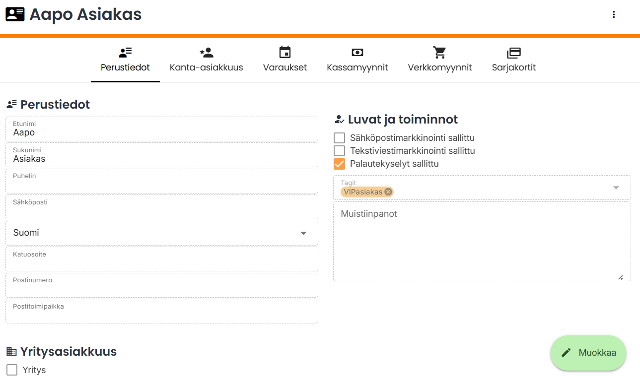 Tageja palvelulle voit lisätä Asetukset -> Palvelut kautta, asiakkaalle Asiakkaat -välilehden kautta ja toimipisteelle Asetukset -> Toimipisteet kautta.