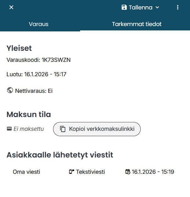 Viestin vastaanottajaksi täyttyy automaattisesti varauksen asiakas ja tämän puhelinnumero, jos asiakkaalla ei ole puhelinnumeroa niin viestiä ei voi myöskään lähettää. Näet varausikkunan Tarkemmat tiedot -välilehdellä asiakkaalle lähetetyt viestit.