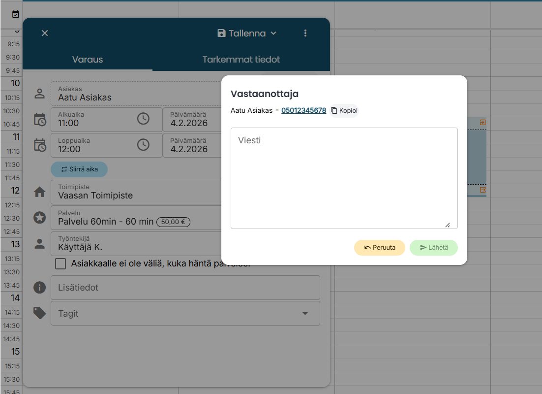 - Kun ole avannut varauksen, voit painaa Teksitiviesti -nappia jolloin aukeaa tekstiviestiruutu.
