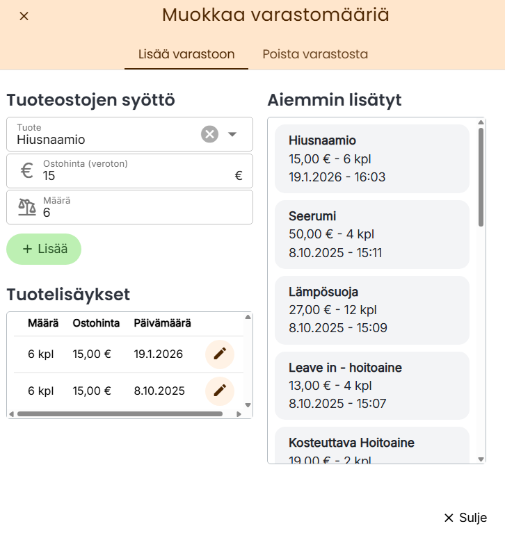 Tämän jälkeen voit lisätä tuoteostot. Tarkista, onko ostohinta oikein ja sen jälkeen syötä ostettu määrä. Kun olet valmis, voit painaa vihreää Lisää -nappia.