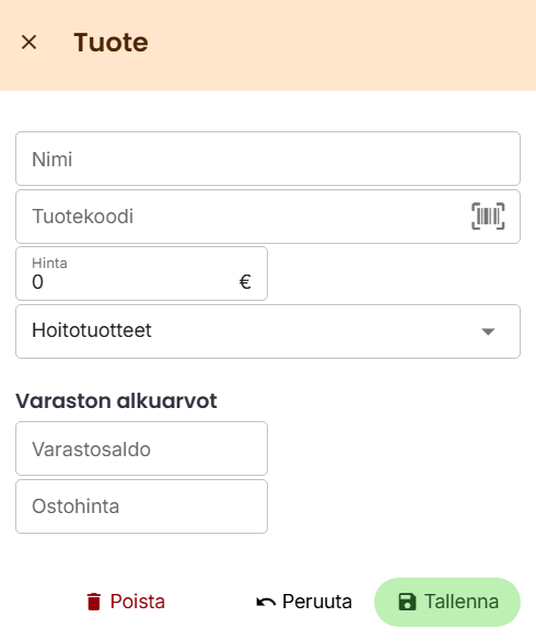 Tuotekoodi on vapaaehtoinen, mutta sen voi täyttää viivakoodinlukijalla tai manuaalisesti. Voit myöhemmin myynnin yhteydessä hakea tuotteita tuotekoodilla.