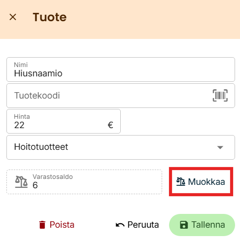 Klikkaa sitten valitsemaasi tuotetta ja sitten varastosaldon vierestä löytyvää MUOKKAA -nappia.