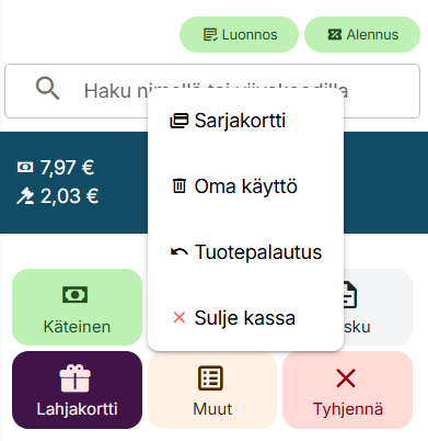 - Valitse omaan käyttöön merkattava tuote tuoterekisteristä normaalisti, kuten myytäessä.