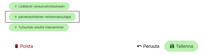 Huomioithan, että verkkomaksun vastaanottoa varten palvelulle tulee määrittää hinta. Myös Asetukset → Varaussivu → Palvelu ja tekijä sivulta Näytä hinnat -toiminto tulee olla käytössä. Jos palvelulla ei ole hintaa, verkkomaksua ei oteta.