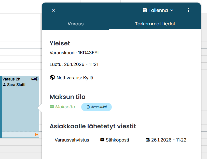 Jos verkkomaksut ovat käytössä ja asiakas ei ole vielä maksanut varaamaansa palvelua varaussivulla, hän voi maksaa sen myös jälkikäteen.
