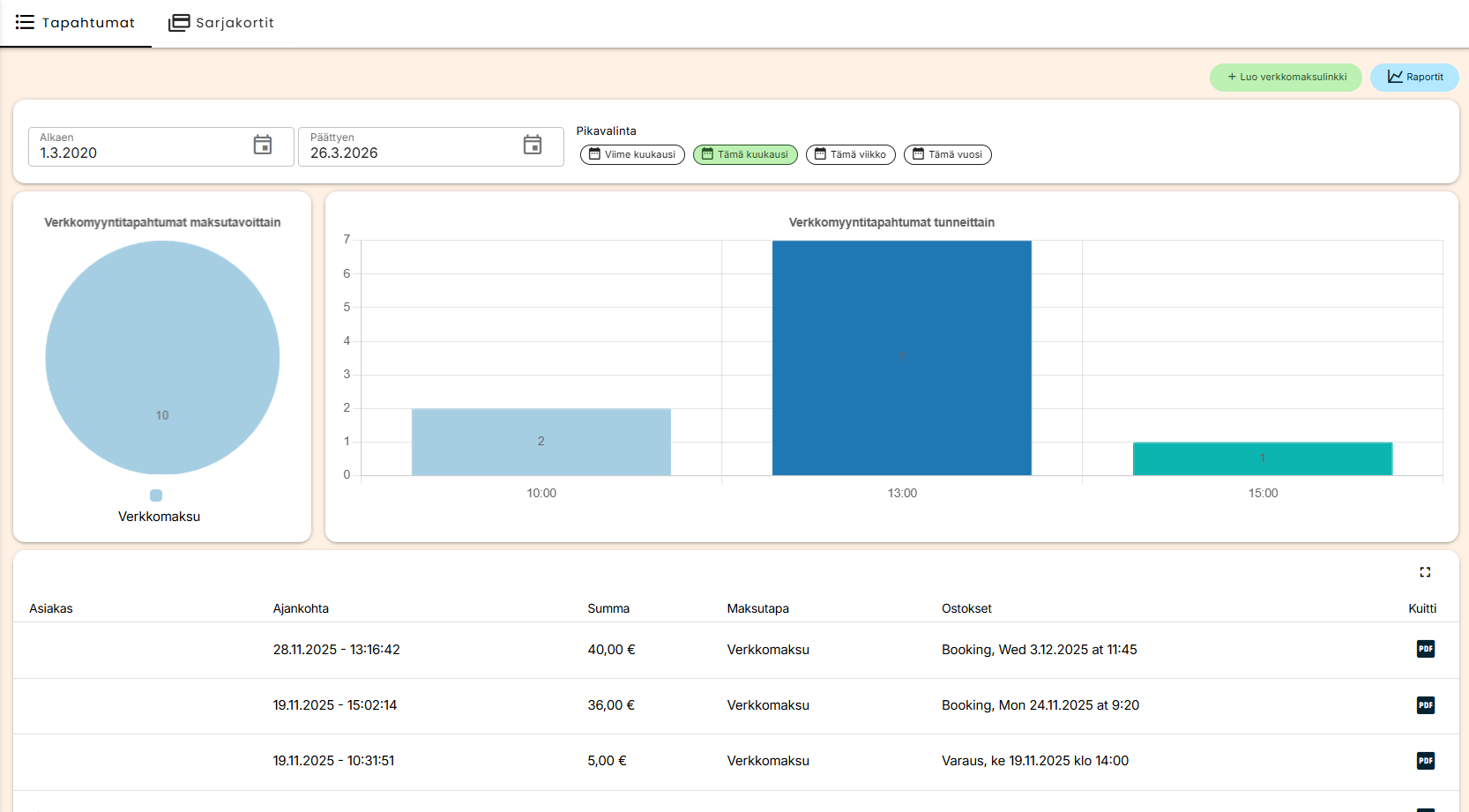 Tapahtumat-näkymästä voit seurata asiakkaiden tekemiä ostoksia ja käytettyjä maksutapoja. Voit hakea verkkomaksuja, luoda verkkomaksulinkin ja siirtyä raportteihin. Lisäksi näet kaaviot verkkomyyntitapahtumista.