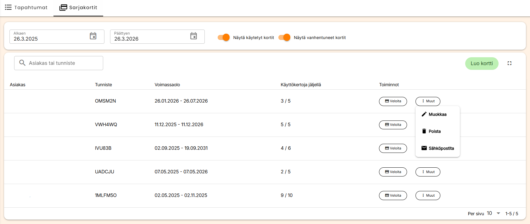 Sarjakortit-näkymästä voit hallinnoida myytyjä ja luoda uusia sarjakortteja. Voit veloittaa sarjakorttia, muokata sitä, poistaa kortin tai sähköpostittaa sen asiakkaalle. Sarjakorttituotteet voit lisätä kuten ennenkin Asetukset → Sarjakortit -näkymästä.